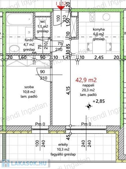 A meghirdetett 1. emeleten található 42,90 nm-es lakásban amerikai konyhás nappali, szoba, fürdőszoba, külön WC, előtér kerül kialakításra. Nappaliból 10,30 nm-es erkély nyílik.