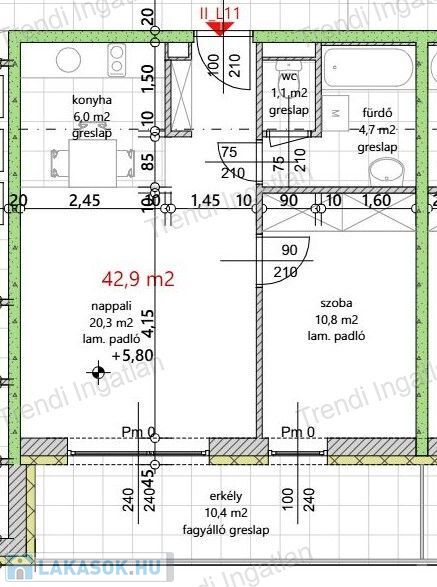 A meghirdetett 2. emeleten található 42,90 nm-es lakásban amerikai konyhás nappali, szoba, fürdőszoba, külön WC, előtér kerül kialakításra. Nappaliból 10,40 nm-es erkély nyílik.