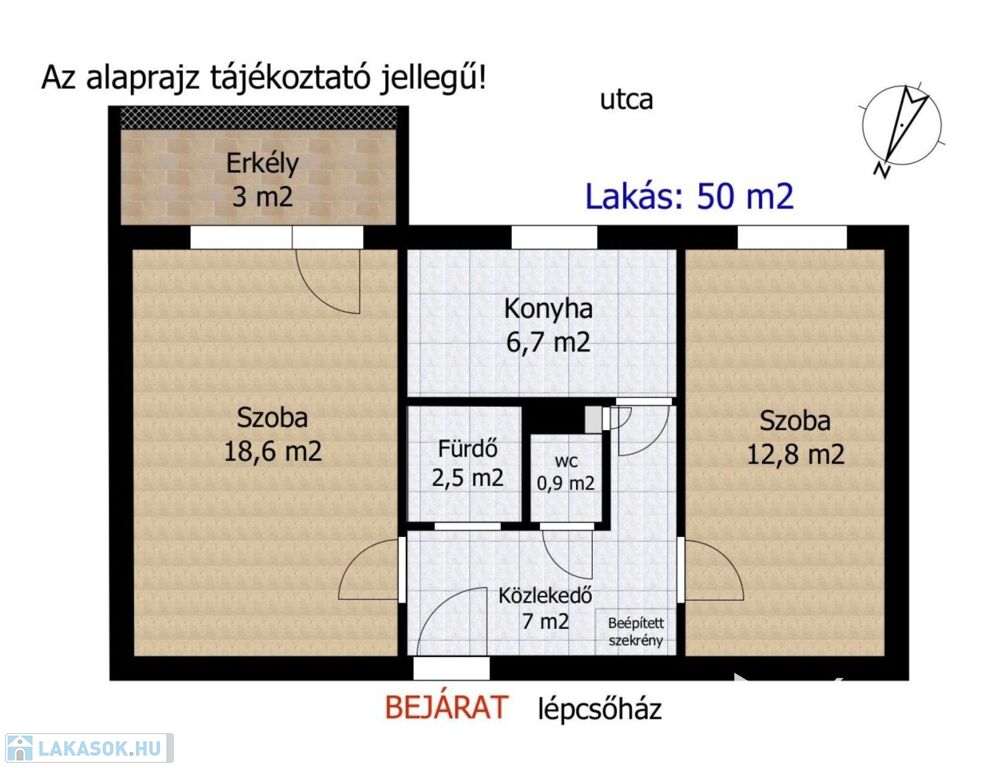 - Beépített szekrények a közlekedőben, melyek sok pakolóhelyet biztosítanak, fürdőszoba külön wc
