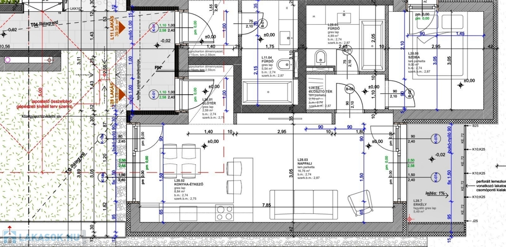 A földszinti 44,78 m2-es L28 LAKÁS HELYISÉGEI: