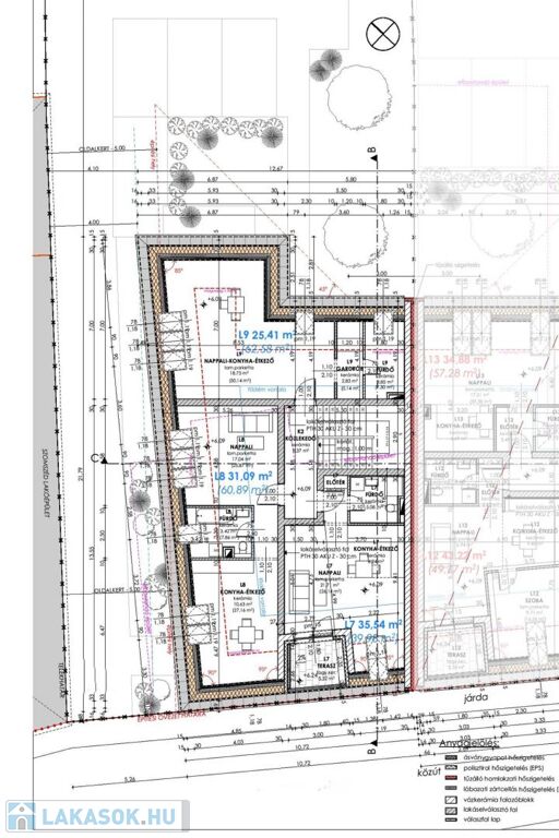 Kerítés 4 oldalról, elektromos kapu lakásonként 1 db távirányítóval, nyitott kukatároló a tervek szerint, helyszínrajz szerinti közlekedők, gépkocsibeállók térkövezve.