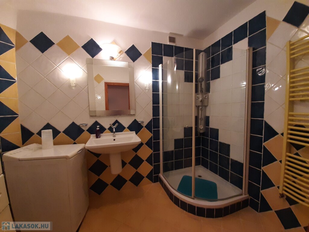 A tágas fürdőszoba zuhanykabinos, itt kapott helyet a mosógép is és egy tárolószekrény is.