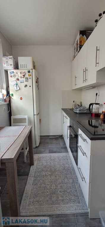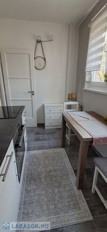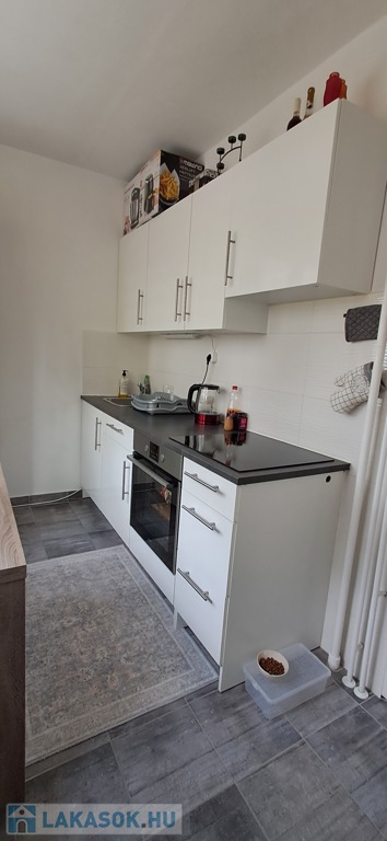 Konyha teljesen felújított, járólapos, ikea konyhaszekrény, beépített sütő és indukciós főzőlap.