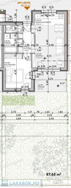 A meghirdetett földszinten található 48,72 nm-es lakásban amerikai konyhás nappali, szoba, fürdőszoba és előtér található. Nappaliból 9,21 nm-es terasz és 87,65 nm-es kertkapcsolat nyílik.