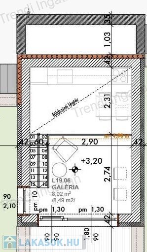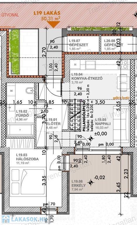 A meghirdetett 1. emeleten található 50,31 nm-es lakásban az alsó szinten amerikai konyhás nappali, szoba, fürdőszoba és előtér található. Nappaliból 7,94 nm-es erkély nyílik. A nappaliból vezető lépcsőn keresztül érhető el a galéria, ami akár hálószobának is alkalmas.
