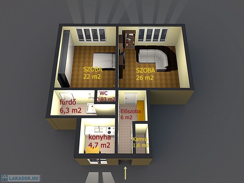 A lakás helyiségei: szoba 26 m2, szoba 22 m2, fürdő 6,3 m2, konyha 4,7 m2, külön WC 0,92 m2, előszoba 6 m2, kamra vagy tároló 1,6 m2.