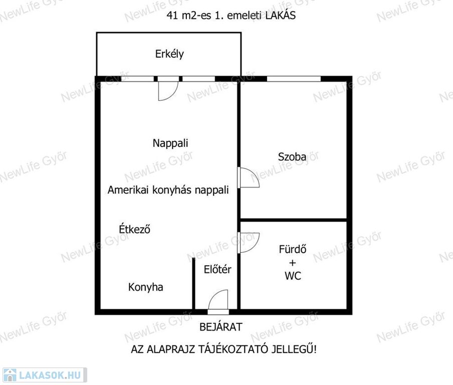 Elosztása: előtér, nappali–konyha–étkező, hálószoba, fürdőszoba–WC