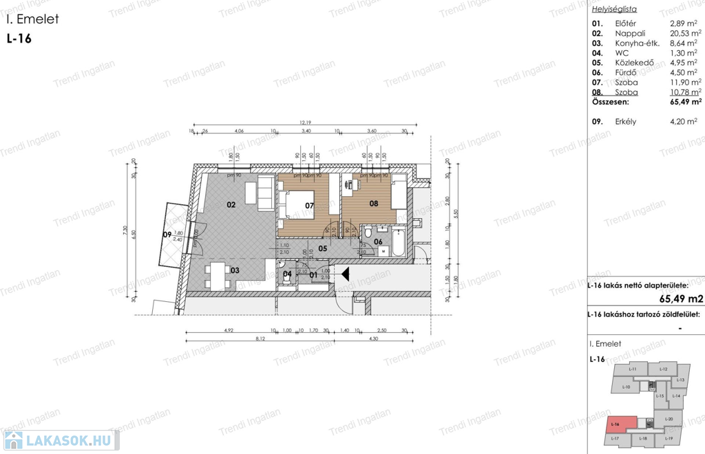 Az 1. emeleten található 65,49 m²-es lakásban amerikai konyhás nappali, 2 szoba, fürdőszoba, külön WC, közlekedő, előtér kerül kialakításra. Nappaliból 4,20 m²-es erkély nyílik.