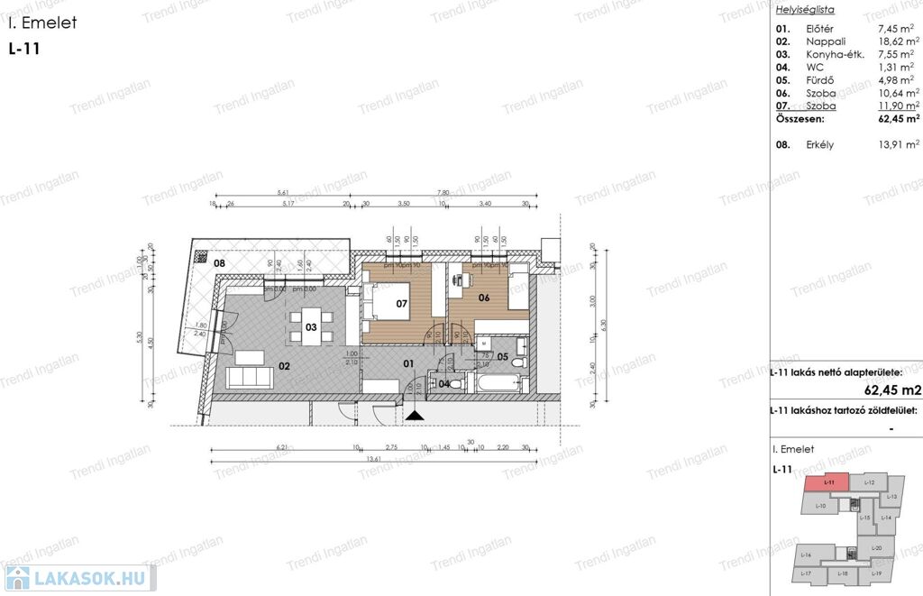 Az 1. emeleten található 62,45 m²-es lakásban amerikai konyhás nappali, 2 szoba, fürdőszoba, WC, közlekedő, előtér kerül kialakításra. Nappaliból 13,91 m²-es erkély nyílik.