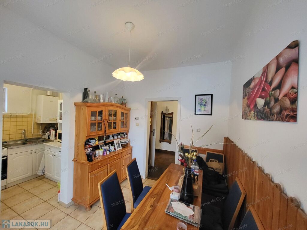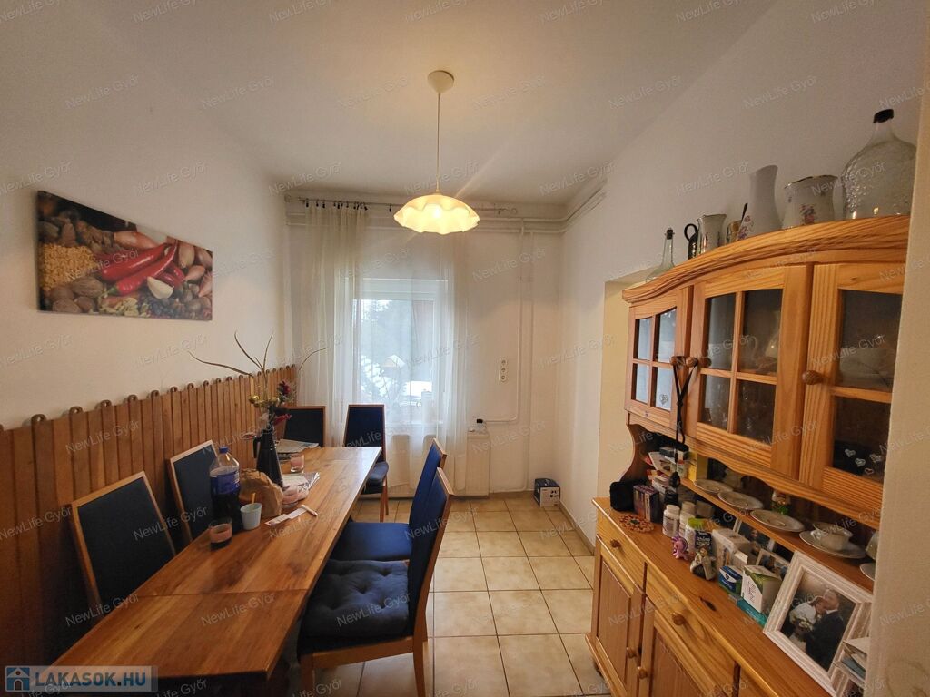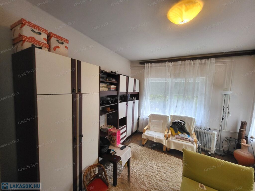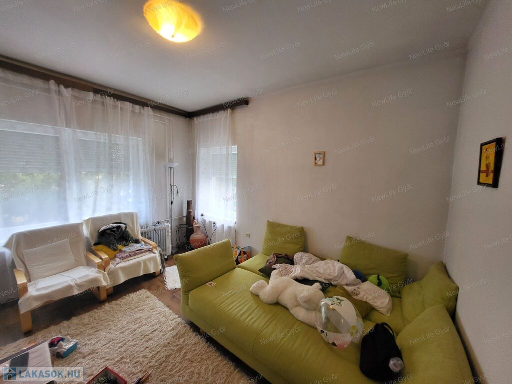 Győr–Ménfőcsanakon, frekventált, mégis nyugodt kertvárosi környezetben eladó egy kétlakásos társasház első emeleti, külön bejáratú lakása, amely valójában egy családi ház teljes felső szintjét jelenti, saját használatú kerttel és melléképületekkel.