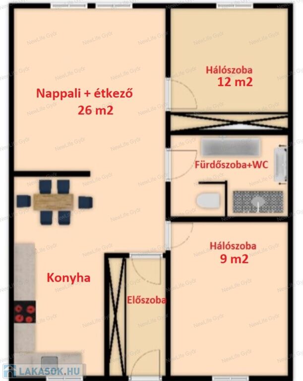 Elosztása: előszoba, konyha étkezővel, nappali, fürdőszoba zuhanyzóval, káddal és WC-vel és két hálószoba.  Az egyik hálószobában és az előszobában is nagy beépített szekrények segítik a tárolást. A lakás vételár része a fotókon látható nappali bútor és komód. Nappali fölött álmennyezet látható beépített spotlámpákkal.
