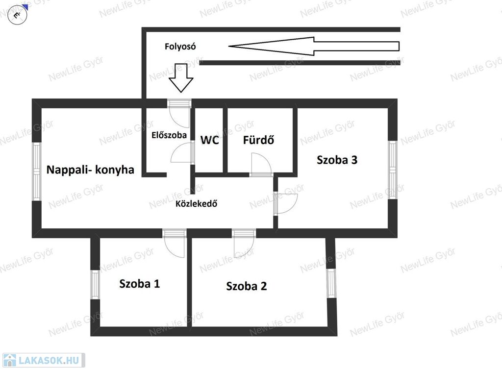amerikai konyhás nappali + 3 különálló szoba, előszoba, külön WC, külön fürdőszoba, közlekedő