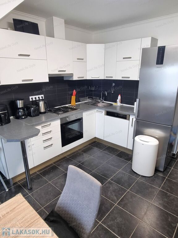 A konyha beépített gépekkel (villanysütő, gáztűzhely, mosogatógép, páraelszívó) felszerelt.