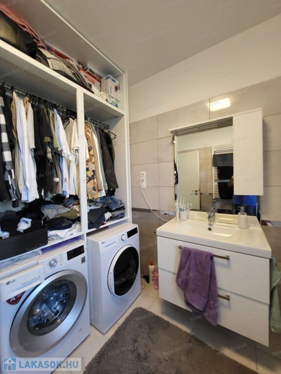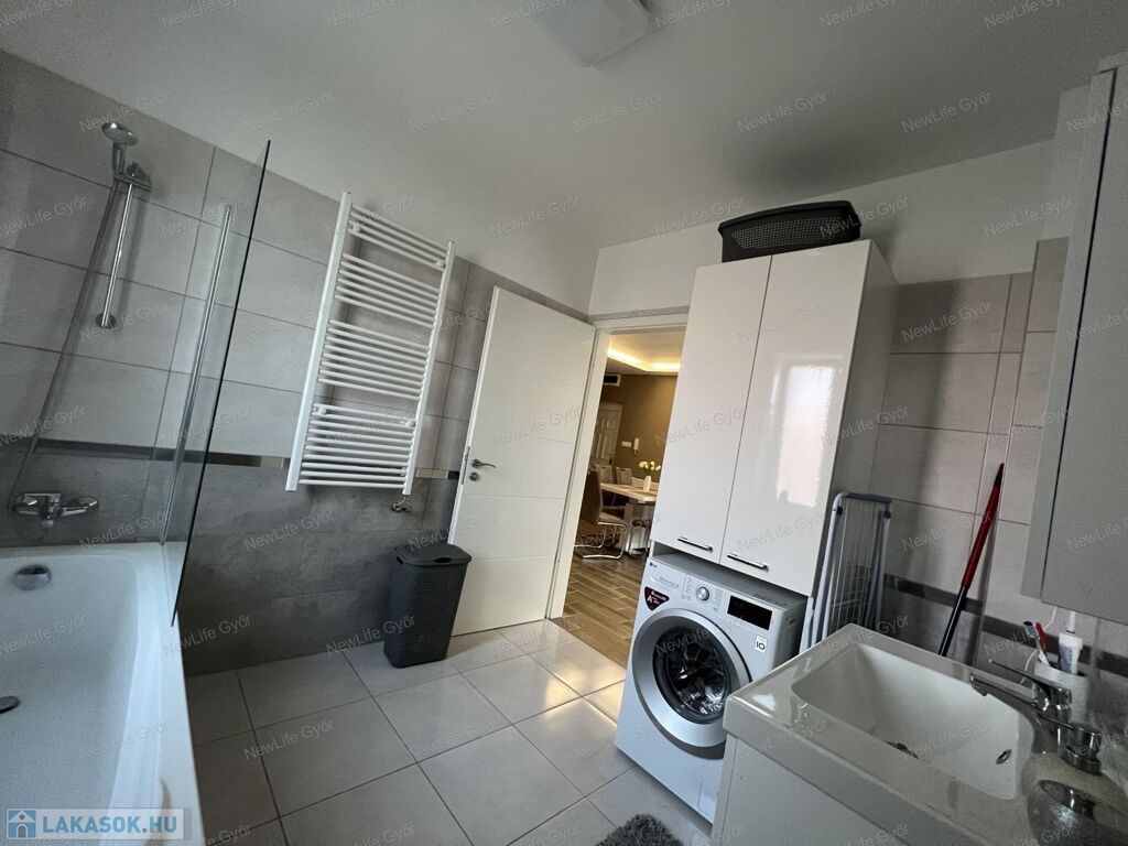 A fürdőszoba (8 m²) a modern lakások egyik mintapéldája – kád, üvegparaván, zuhanyzási lehetőség, mosó- és szárítógépnek kialakított hely, plusz extra beépített szekrények teszik tökéletessé.