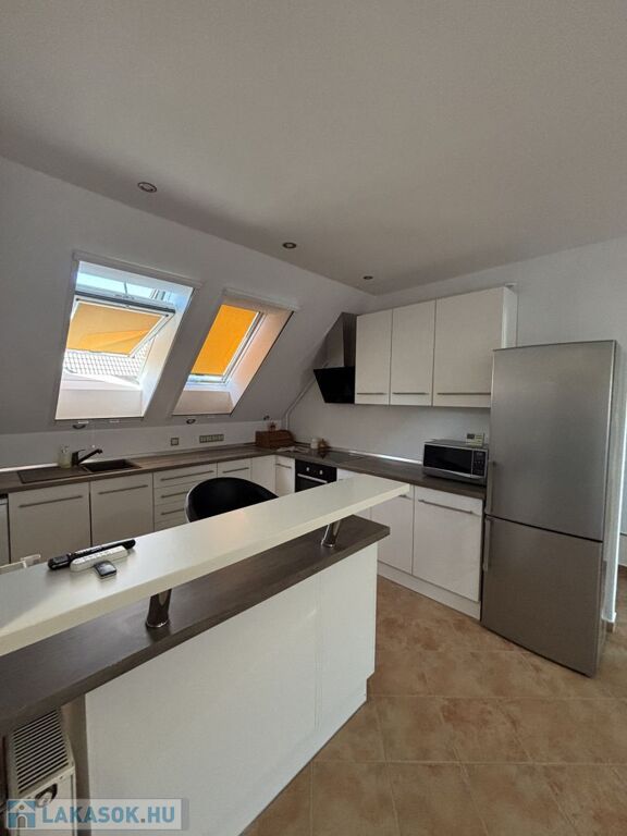 A modern konyhabútorral kialakított, néhány éve teljesen felújított konyha prémium Bosch gépekkel felszerelt (hűtő, főzőlap, légkeveréses sütő, mosogatógép), Samsung mikróval és Kata design páraelszívóval.