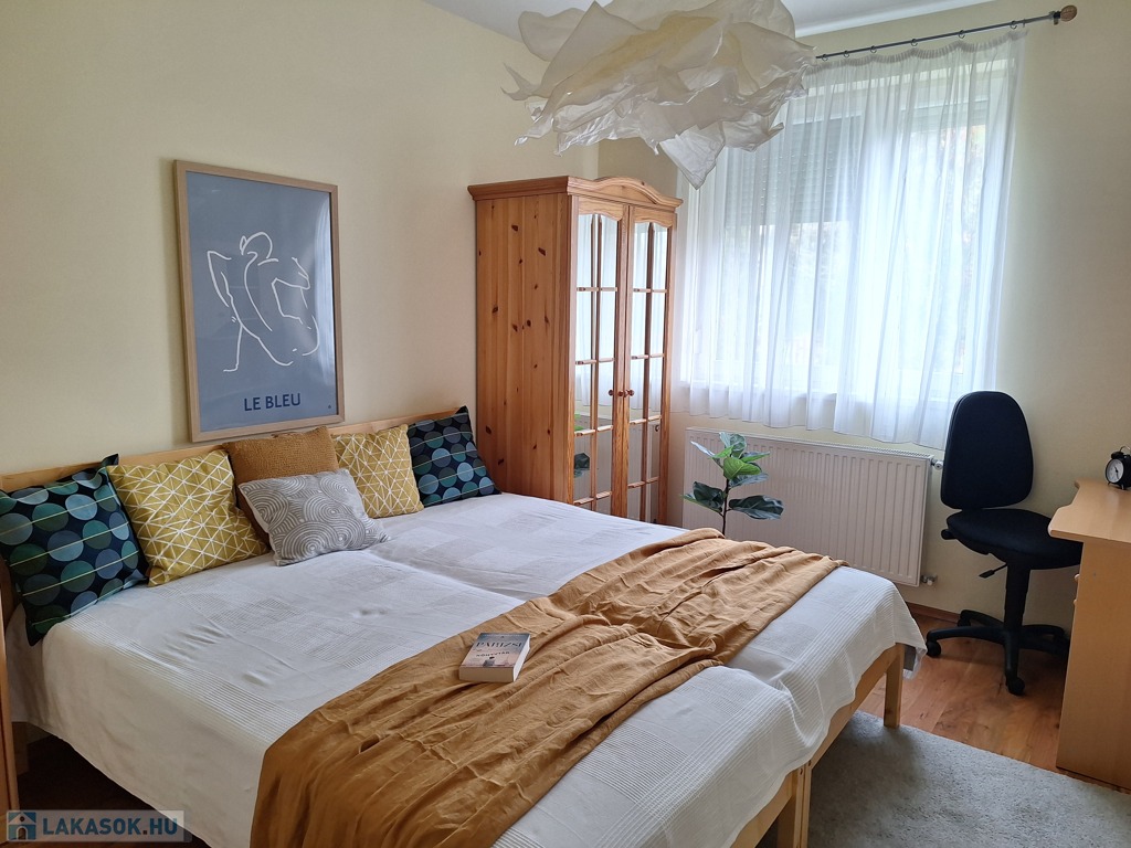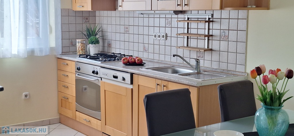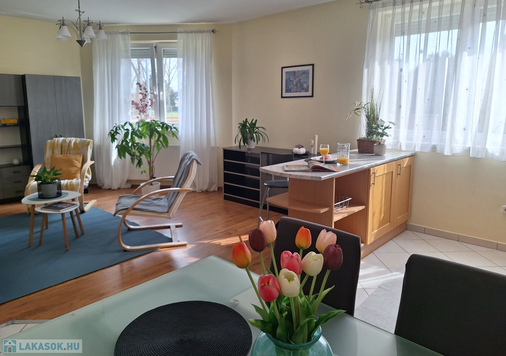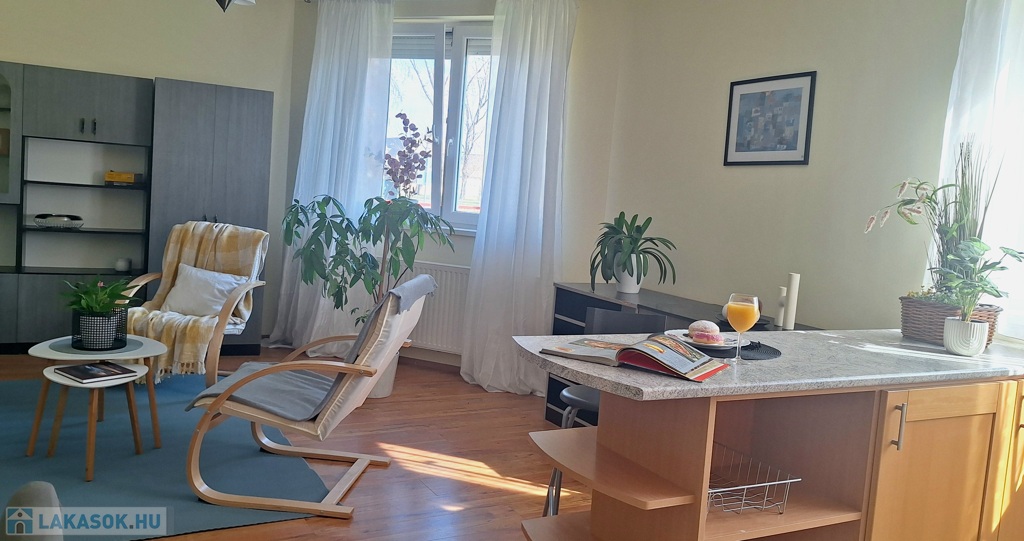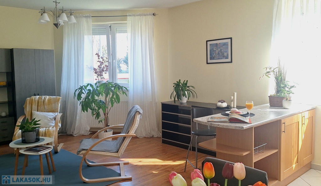 A lakás dél-keleti fekvésű, nagy ablakai a szépen parkosított udvarra néznek. A hálószobákat a reggeli napsütés éri, majd ráfordul az étkező-konyha-nappali együttesére. A lakást a meleg barátságos színek jellemzik. A fa konyhabútor beépített, szagelszívóval, mosogatógéppel, villanysütővel, gáz főzőlappal szerelt. A konyhát és a nappalit konyhasziget választja el egymástól. Bőven jut hely családi ebédeknek is, a 6 személyes asztal mellett. A hűtőszekrény jelenleg a kamrában kapott helyet.