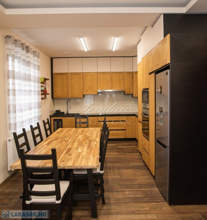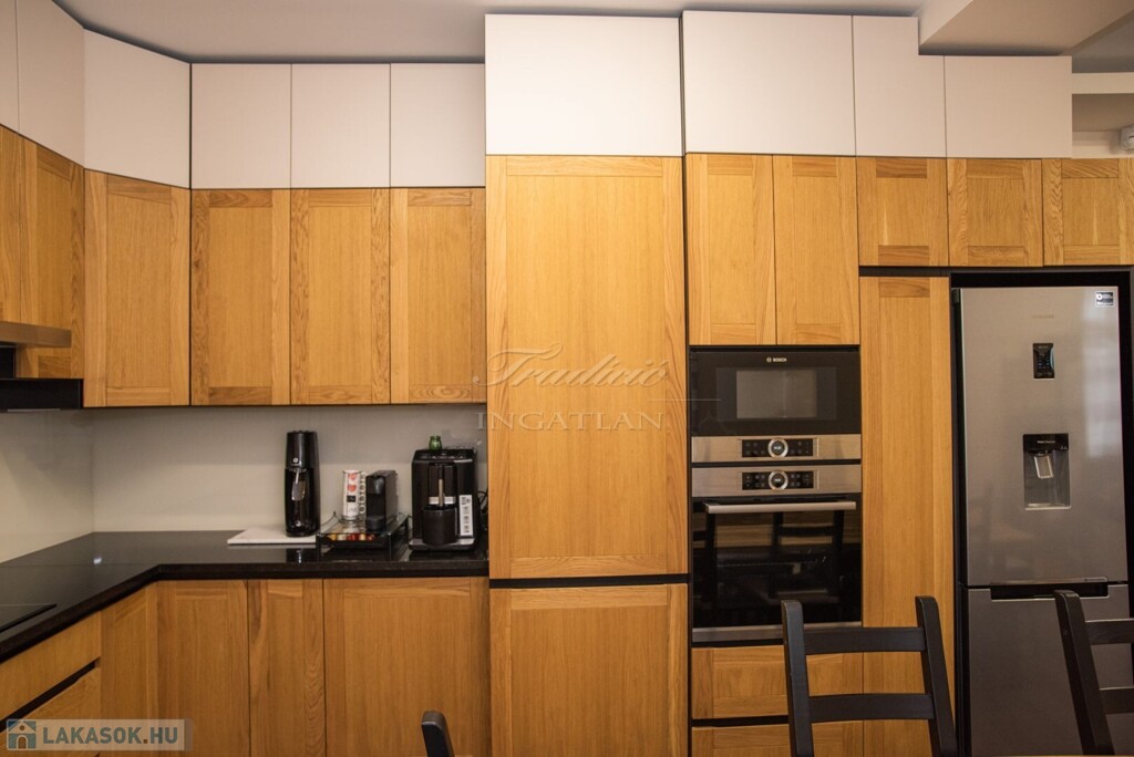 • Konyha: prémium VINYL burkolat, tömörfa konyhabútor, fekete gránit munkalap, lacobel üveg hátfal, beépített Bosch gépek, borhűtő, GREE inverteres klíma.