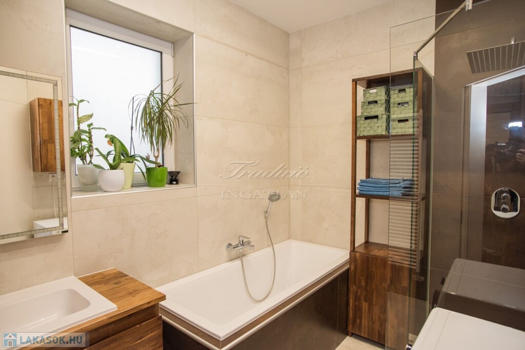 • Fürdőszoba és külön WC: mennyezetig érő greslap burkolat, kád és zuhany, elektromos padlófűtés, kombinált radiátor (elektromos vagy gázcirkó), egyedi, fűthető tükör, integrált szagelszívás.