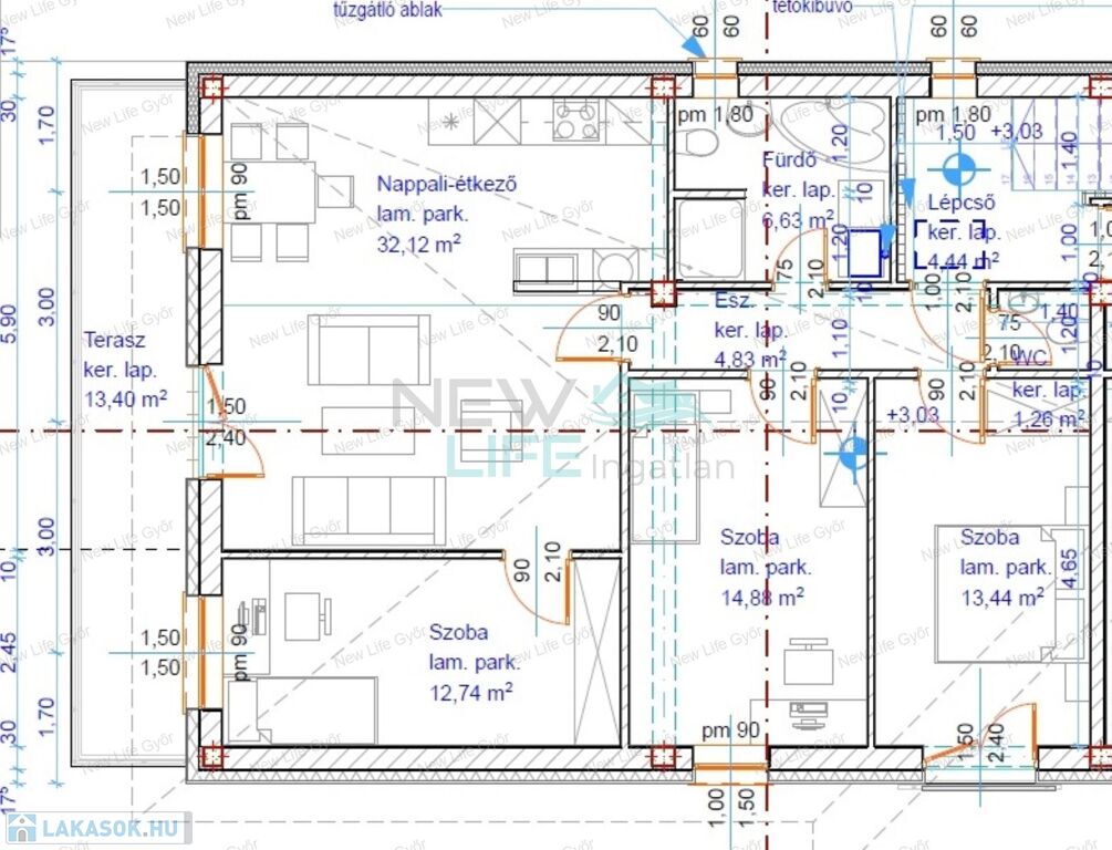 Elosztása: amerikai konyhás nappali étkezővel, három hálószoba, fürdőszoba káddal, WC-vel és egy külön WC, nagy (13,4 m2) terasz.
