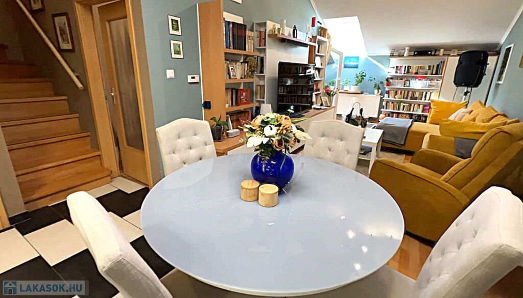 • Tökéletes elosztás: földszinten étkező-konyha-nappali, szoba, fürdő káddal, wc és egy terasz, ami a nappaliból és a szobából is elérhető