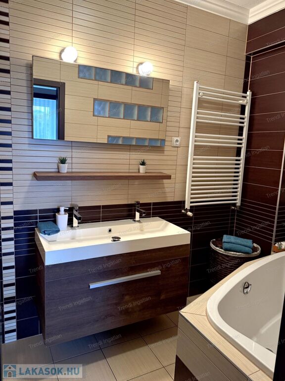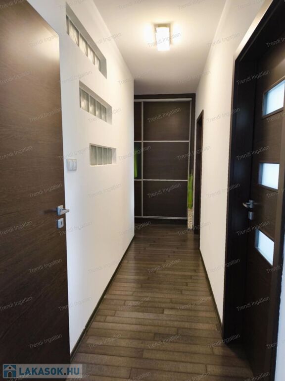 A kényelmes otthonba lépve egy tágas előtérbe érünk, ahonnan az amerikai konyhás nappali tárul elénk. A nappaliból a zárt, parkosított, hatalmas zöld udvarra néző fedett 4,67 m²-es erkély nyílik, amely tökéletes helyszín egy reggeli kávézásra vagy esti kikapcsolódásra. Nappalit az egyedi gipszkarton polcok teszik hangulatossá. A konyha beépített gépekkel (sütő, főzőlap, mikrohullámú sütő, elszívó, hűtő) felszerelt. A nappali és a konyha spot világítással rendelkezik. A közlekedőből elérhető 2 szoba és a hálószoba, melyből egy praktikus kialakítású gardrób nyílik. Az asztalos által készített gardróbszekrény megfelelő helyet biztosít a ruháknak és a cipőknek. Az egyik szoba és a hálószoba egyedi gipszkarton polcos rendszerrel rendelkezik, továbbá a hálószobában spot lámpák biztosítják a világítást. A fürdőszobában kád, dupla mosdó, WC található. A közlekedőből nyílik egy vendég WC. A folyosón az előtér mellett helyet kapott egy egyedi, asztalos által készített hatalmas beépített szekrény, melyben külön szekrényrészek vannak kialakítva a praktikus és könnyebb tárolás érdekében.