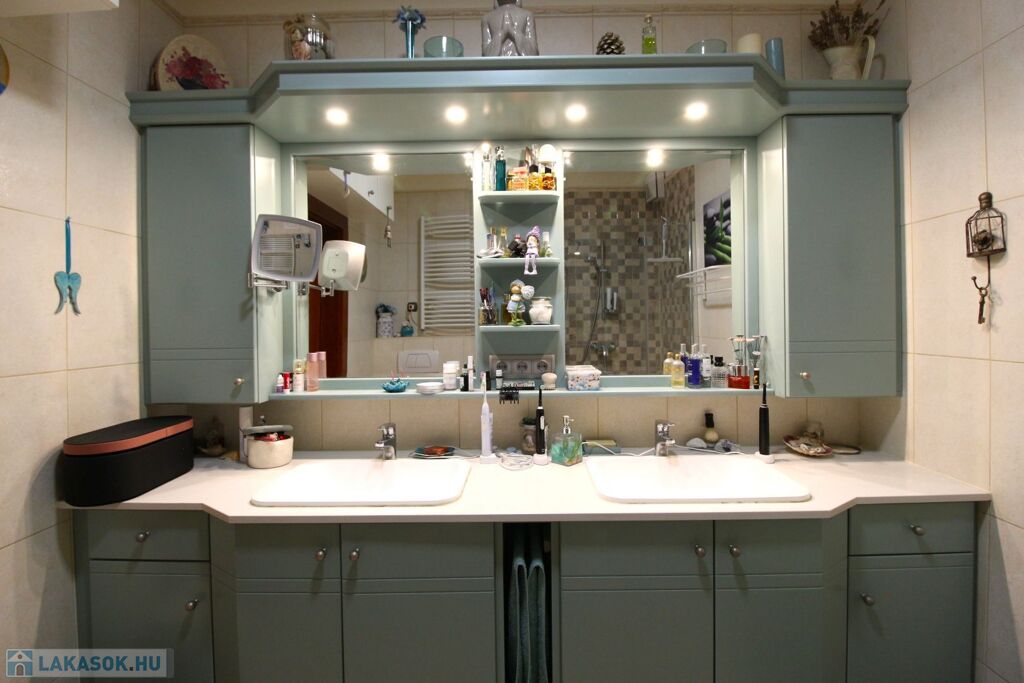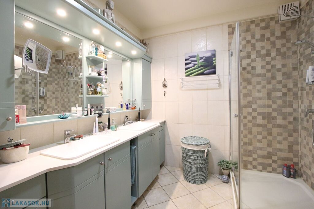 A fürdőben dupla mosdó, zuhanykabin.