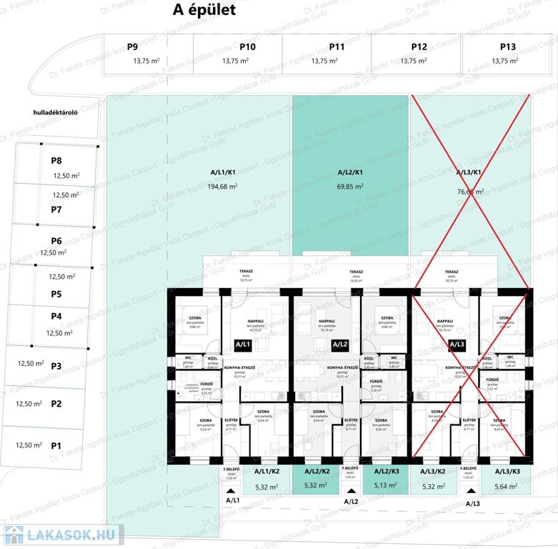Minden lakás mérete megegyezik, csak a kert mérete változó. (Lásd alaprajzok)
