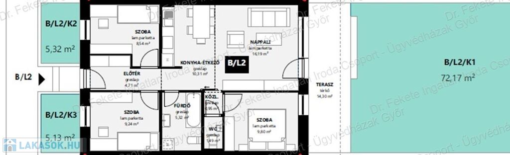 Nettó lakótér: 66,55 nm + 14,3 nm terasz + 72 nm saját kert.