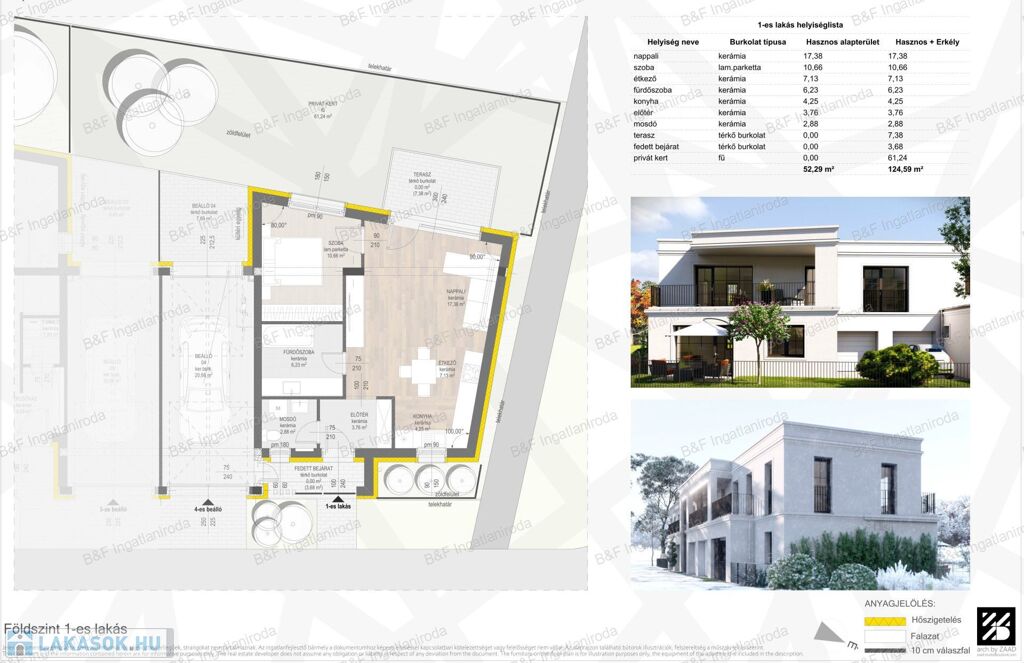A lakás hasznos alapterülete 52,29 m2 + van hozzá 7,38 m2 terasz + 3,68 m2 fedett bejárat + 61,24 m2 privát kert.