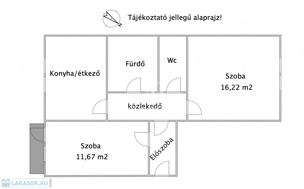 - 1 egész szobából, 1 félszobából, előszobából, konyhából/étkezőből, fürdőszobából, valamint WC-ből áll.