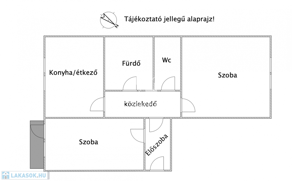 - 1 egész szobából, 1 félszobából, előszobából, konyhából/étkezőből, fürdőszobából, valamint WC-ből áll.