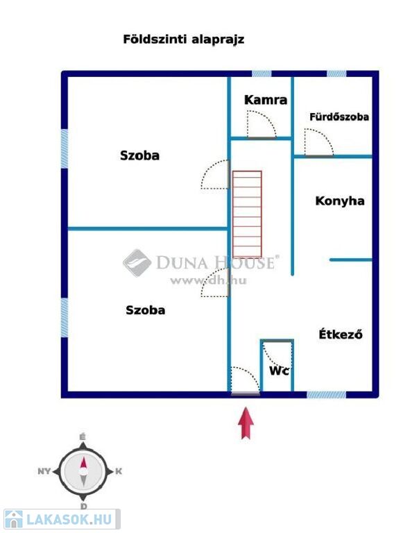 A földszinten 2 nagy méretű szoba, konyha, étkező, kamra, fürdőszoba és külön wc helyiség van.