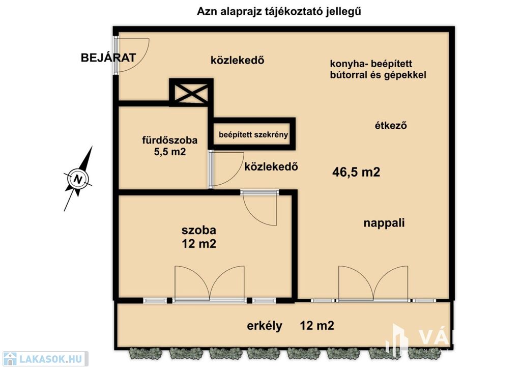 A lakás keleti tájolású, 59 m2 és egy 12 m2-es erkély tartozik hozzá.