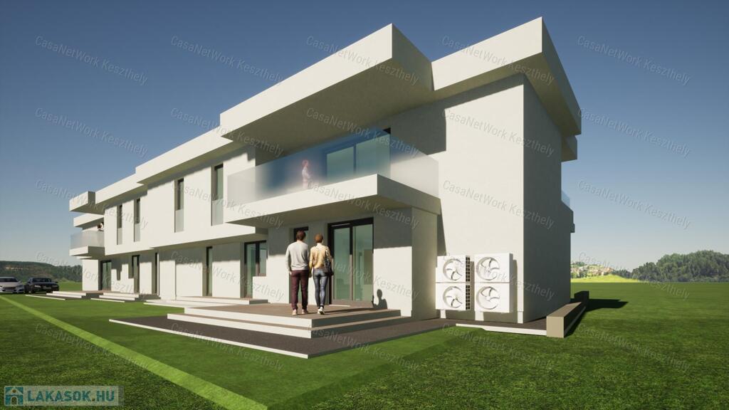 alapterületű, kertkapcsolatos földszinti lakás, amely egy most épülő, lapostetős, hőszivattyúval ellátott, négylakásos társasházban található. Várható