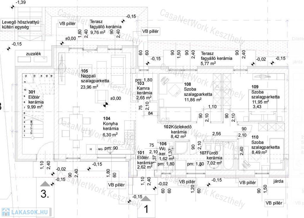 alapterülete 89 m2 (amerikai konyhás nappali, 3 hálószoba, fürdőszoba, wc, közlekedő), amelyhez egy