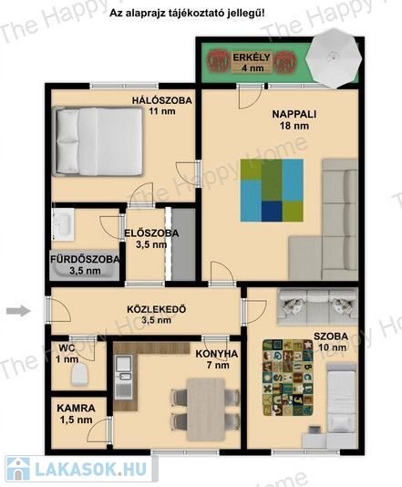A bejárati ajtón belépve az előszobából balra nyílik egy közlekedő (praktikus beépített szekrénnyel), innen jutunk el a fürdőszobába, illetve az egyik (11 nm-es) lakószobába. Az előszobában tovább haladva jobbra találjuk a konyhát, amelyből egy kis kamra nyílik, illetve a 18 nm-es nappalit és a 10 nm-es további szobát. A WC külön helyiségben található. A nappaliból tudunk kilépni a 4 nm-es erkélyre.