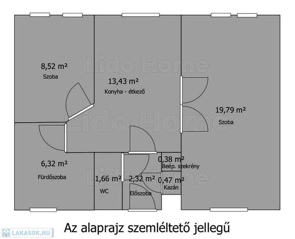- előtér, konyha – étkező, beépített szekrény, 2 hálószoba, fürdőszoba káddal, külön WC