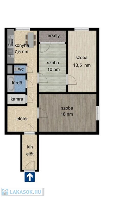 - 3 szoba, konyha, fürdő, WC, erkély, kamra, előtér.