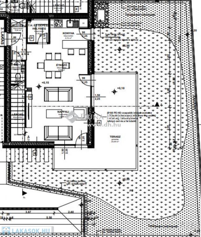 .A 3.számú lakás 87,66 m2.Térfelosztása az alábbi:Földszint: nappali, konyha-étkező, háztartási helyiség, WC, előtér,Emelet: 3 külön bejáratú szoba, fürdő és közlekedő. A környezettel való kapcsolatot a 24,59 m2-es terasz és a kizárólagos használatú saját kert biztosítja.