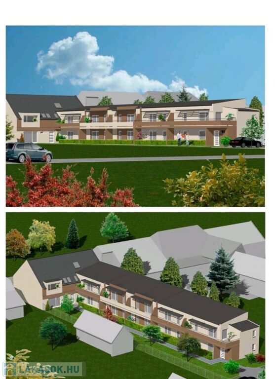 Jánossomorja központi részén épülő társasházban 1 emeleti, emelt tégla parapetes tetőtéri 35m2 nettó lakóterületű, nappali plusz 1 hálószobás, 4,2m2-es erkélyel rendelkező téglalakás eladó.