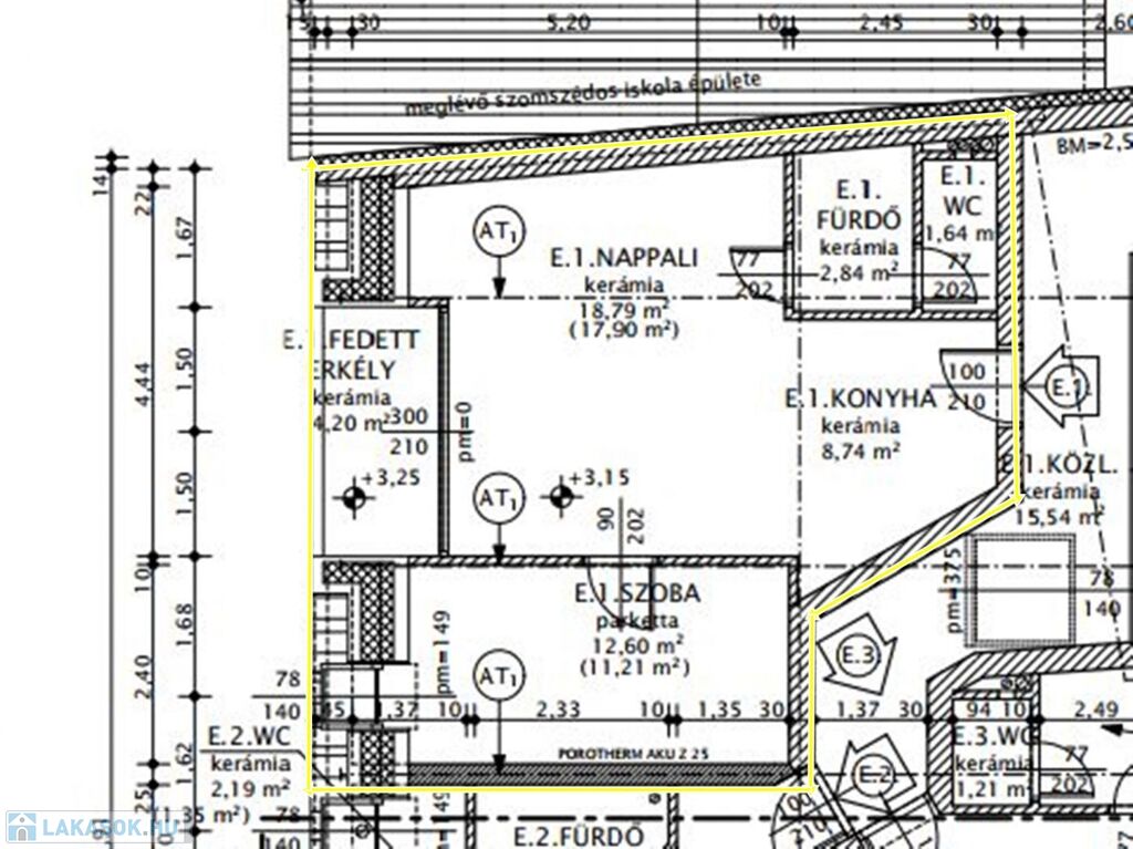 nappali 17,9 m2/bruttó 18,79 m2, konyha 8,74 m2, szoba 11,21 / bruttó 12,6 m2, fürdő 2,84 m2, WC 1,64m2 + FEDETT ERKÉLY 4,2 m2.