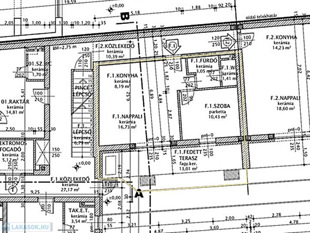 nappali 16,73 m2, konyha 8,19 m2, szoba 10,43 m2, fürdő 3,05 m2, WC 1,41 m2,