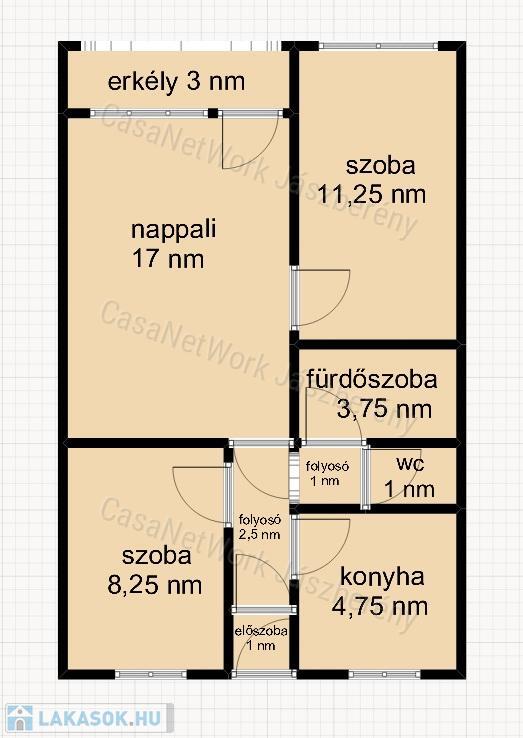 - az ingatlanban található helyiségek: szobák (8,25 m2) és (11,25 m2) valamint a nappali 17 m2 parkettás, konyha 4,75 m2, fürdőszoba 3,75 m2, wc 1 m2, folyosók (2,5 m2) és (1 m2), előszoba 1 m2, erkély 3 m2-es járólap padlóburkolatúak.