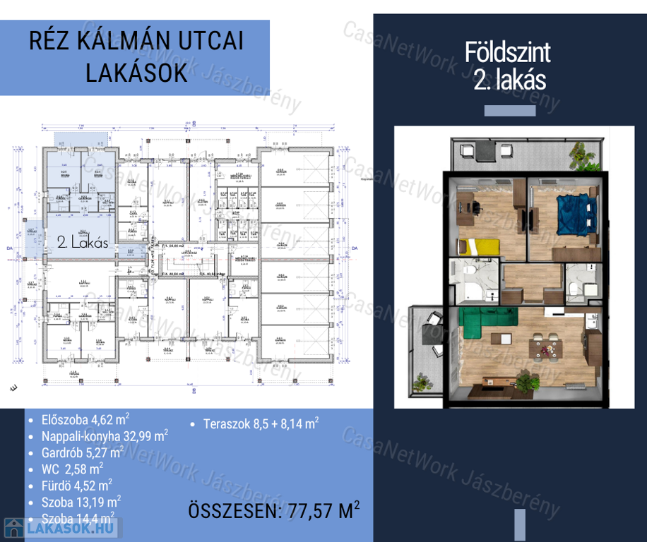 Földszinti (2.) lakás: előszoba (4,62 m2), nappali+konyha (33 m2), szoba (13,19 m2), szoba(14,40 m2), fürdő(4,52 m2), wc (2,58 m2), gardrób(5,27 m2), terasz1 (8,30 m2), terasz2 (8,14 m2)
