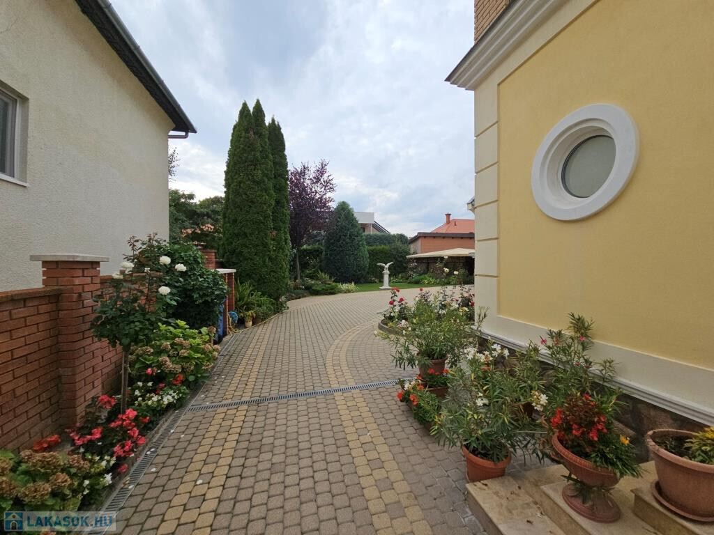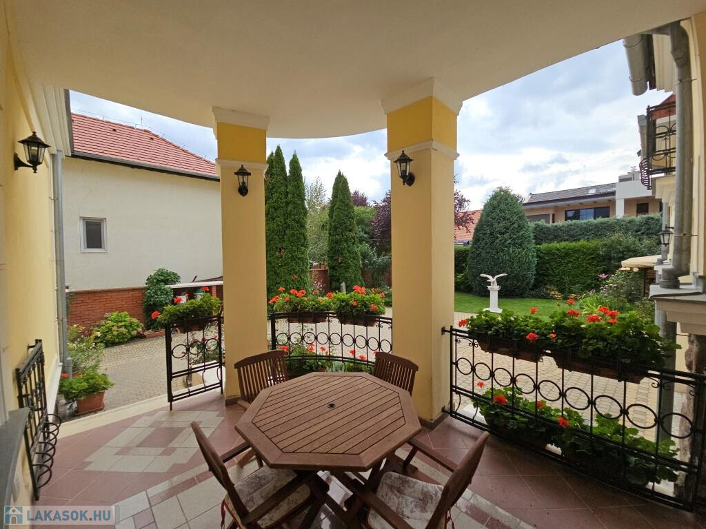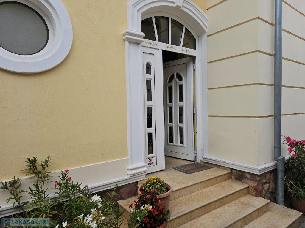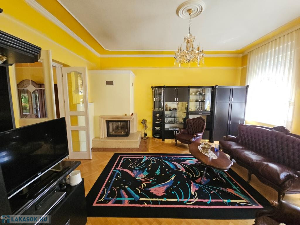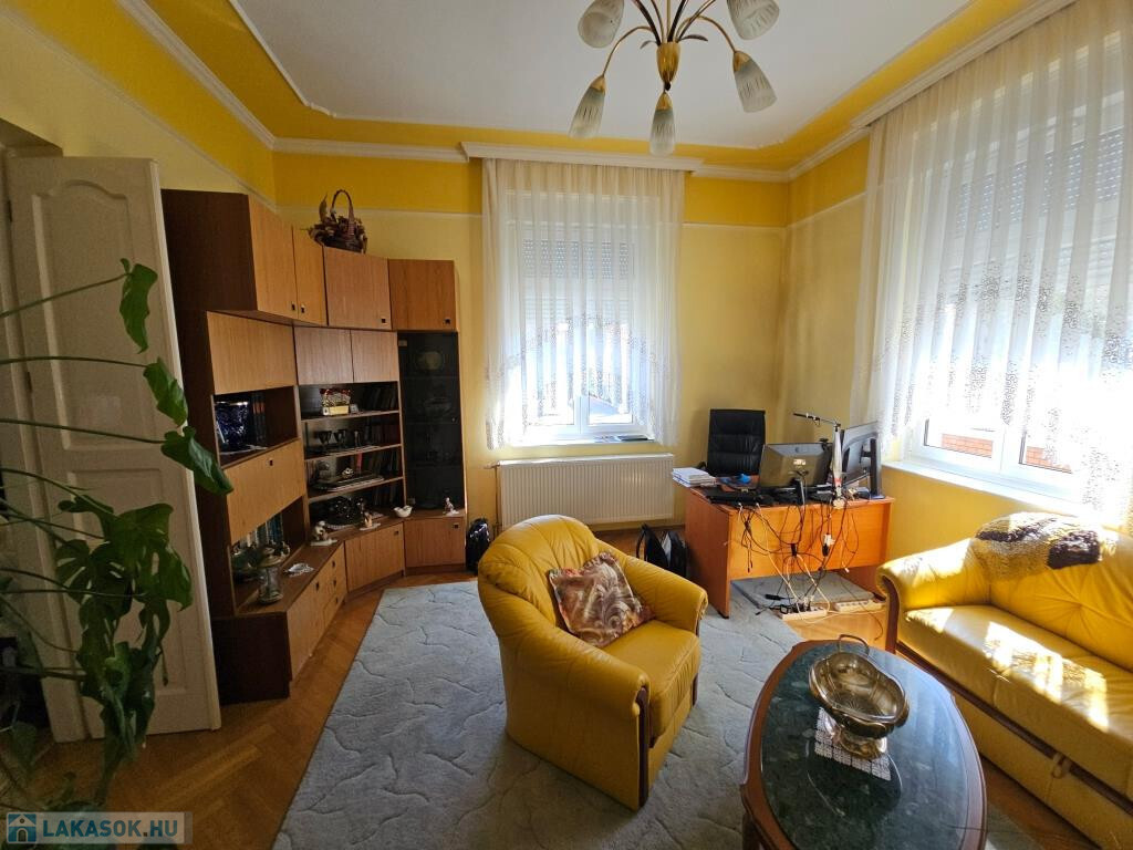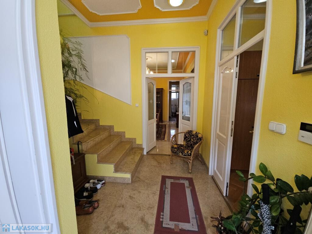 Kaposvár egyik legszebb utcájában, a Kassa utcában kínáljuk megvételre ezt az igazán igényesen megtervezett és felújított, kibővített elegáns kétlakásos polgári családiház önálló földszinti lakását a hozzá tartozó teljes telekkel. Az étkező helyezkedik el középen, ide csatlakozik a délnyugati fekvésű, kert felé néző kellemes terasz, illetve innen nyílik minden további helyiség közvetve vagy közvetlenül. Van három tágas, keleti tájolású szoba - a szélső déli ablakkal is ellátva, - fürdő zuhanyzóval és káddal, külön WC, valamint a konyha. Plusz egy háztartási helyiség, ami részben mosókonyha, részben tároló, de itt kapott helyet a kazán és a bojler is. Mindhárom szoba megközelíthető külön is, de az első és a középső át is járható. Az első, délkeleti szobának önálló bejárata nyílik a lépcsőházból is, így akár iroda funkcióra is alkalmas. A nappaliként használt középső szobában van egy üvegfalú kandalló, ami nem csupán szép és jó hangulatú, hanem hasznosan egészíti ki a cirkós fűtést. Minden külső nyílászáró SCHÜCO tip., hőszigetelt üvegezéssel, redőnnyel. A lakás alatt több részből álló pince, hátul dupla garázs és melléképület áll rendelkezésre, ezek összesen 209 m2-et tesznek ki (lakótér: 128,54 m2, terasz: 13,31 m2, pince: 28,14 m2, garázs és tárolók: 39 m2). A telek 630 m2, a garázsokig térkövezve, egyébként gyeppel borított, szépen parkosított. Mind a lakás, mind a kert kiváló állapotban vannak. A 3 fázis vételezése mind az udvaron, mind a garázsban rendelkezésre áll. Elsősorban Pécsen vagy környékén építési telket, családi házat értékegyeztetéssel beszámítunk kizárólag olyan helyen, ahol van vezetékes internet.