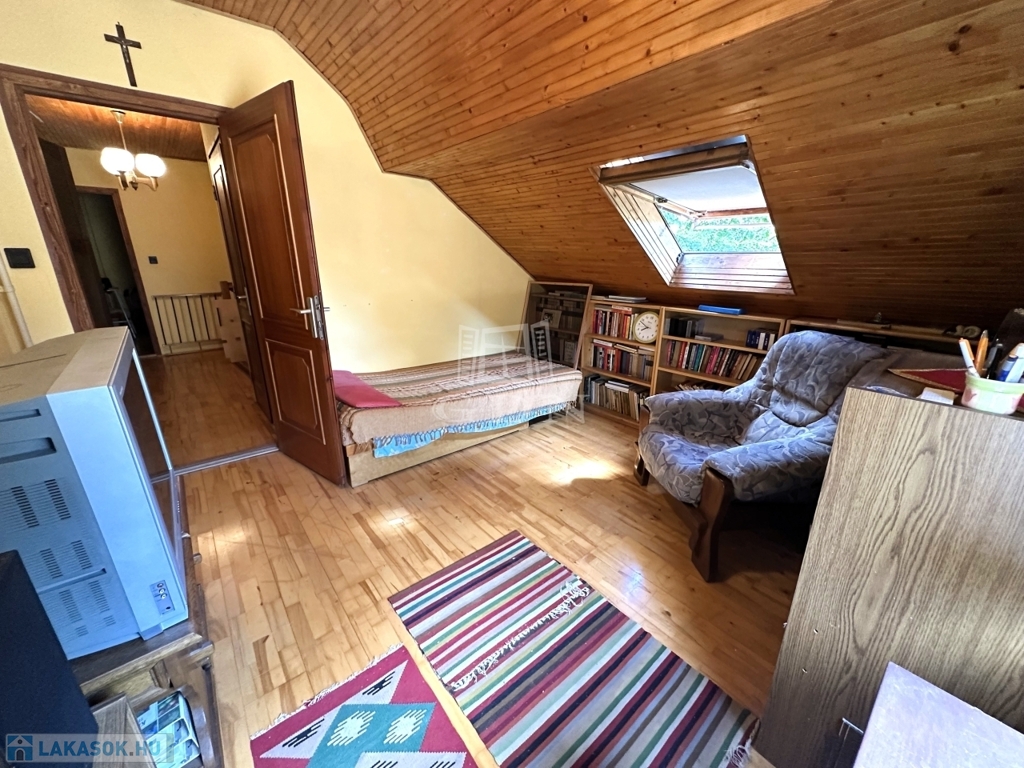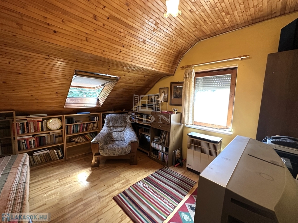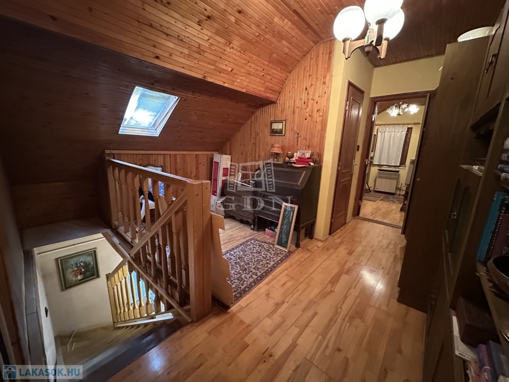 Az alsó, 52 m2-es szinten egy méretes gardróbos és tárolós előtér, konyha, kamra, fürdőszoba, nappali, valamint egy szoba, míg az ingatlan emeletén 2 szoba, egy dolgozó és egy mellékhelyiség került kialakításra.