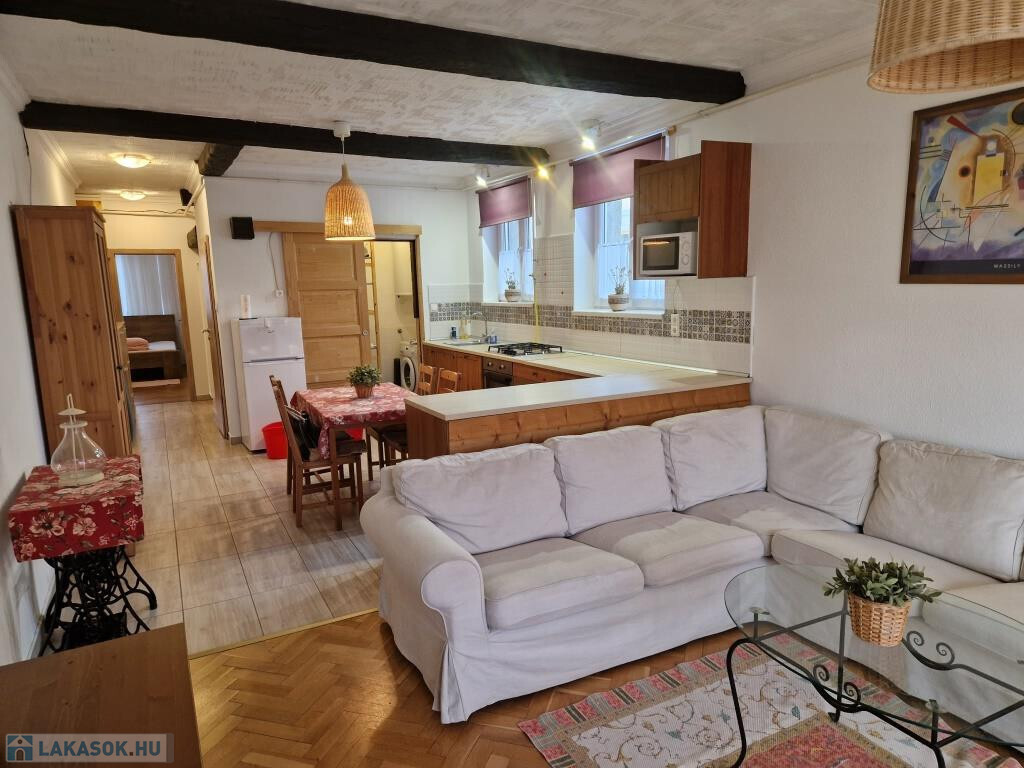 Kaposvár belvárosában, a Somssich utcában kínálunk megvételre egy nagyobb méretű, 75 m2-es lakást a társasház második emeletén. Elrendezése kiváló. A nappalihoz déli fekvésű erkély csatlakozik, és ez a helyiség egybe van nyitva a keleti tájolású étkezős konyhával. Így egy jól kihasználható, tágas, világos közös élettér tárul elénk. A konyha és a fürdő között találjuk a konyhából megközelíthető kis háztartási helységet a mosógéppel, bojlerral és tároló polcokkal, valamint a közlekedőből nyíló, külön kialakított WC-t. Szintén a közlekedőből juthatunk a fürdőbe és a két hálószobába. A lakás igazán otthonos, barátságos, és nagyon jó állapotban van. Külső nyílászárói hőszigeteltek, műanyag keretesek, fűtése a két hálóban elektromos norvég panelekkel megoldott, míg a nappaliban újabb típusú gázkonvektor ad meleget. A villanybojler éjszakai áramról működik, a rezsi kifejezetten kedvező. A lakás a teljes bútorzattal együtt eladó. Tartozik hozzá lent saját tároló, és a zárt udvarban 18 m2-es önálló garázs is. A garázs ára plusz 7 MFt, együtt kell megvenni a lakással.