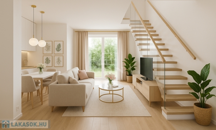 A lakásban az alsó szinten egy tágas közösségi tér (nappali-konyha-étkező), előtér és mellékhelyiség kerül kialakításra, míg a felső szinten két szoba, gardróbszoba és fürdőszoba kap teret. Igény esetén a lakásban egy további szoba is kialakítható. A lakás nappalijából egy méretes 17 m2-es erkély, míg a felső szinten az egyik szobából 3 m2-es erkély nyílik a zölddel borított udvarra.
