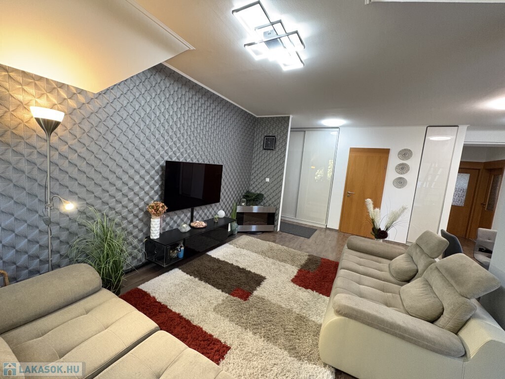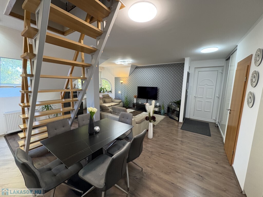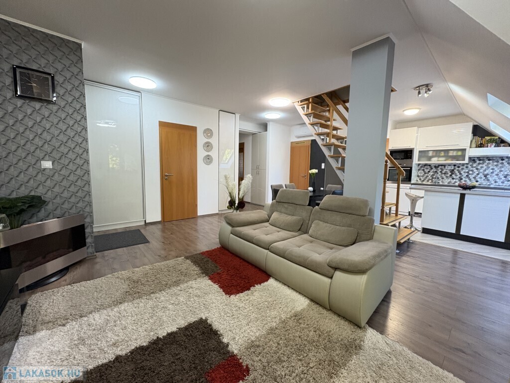 Kaposváron a belvárosban, a Fő utcában - közvetlenül a kórház közelében - található 1999-ben épült, kifejezetten rendezett társasház 3. emeletén lévő 121 m2-es, ideális elosztású, nagyon jó állapotú két szintes lakás eladó. A lakás alsó szintjén előszoba-nappali-étkező-konyha, kamra, 2 szoba - közös erkéllyel, fürdőszoba, wc-kézmosó helyiségek találhatóak. A felső szinten előszoba-közlekedő, 2 szoba, fürdőszoba, wc kerültek kialakításra. A lakás rezsi költsége nagyon kedvező, a fűtést és a melegvízet új Immergas kombi gázkazán szolgáltatja, a nappaliban és a tetőtéri 2 szobában 1-1 új Gree légkondícionálót szereltetett fel a tulajdonos. A társasháznak nagyon szép, rendezett udvara van, ahová 1 személyautóval ingyenesen tud parkolni a lakás tulajdonosa.