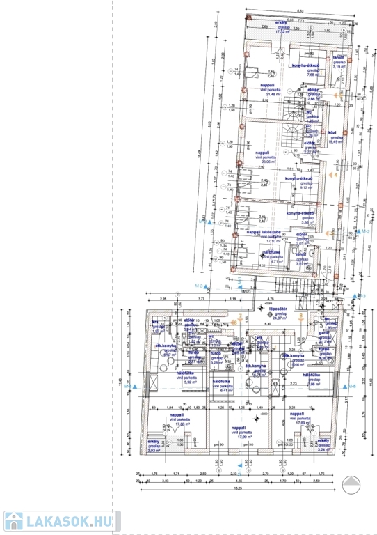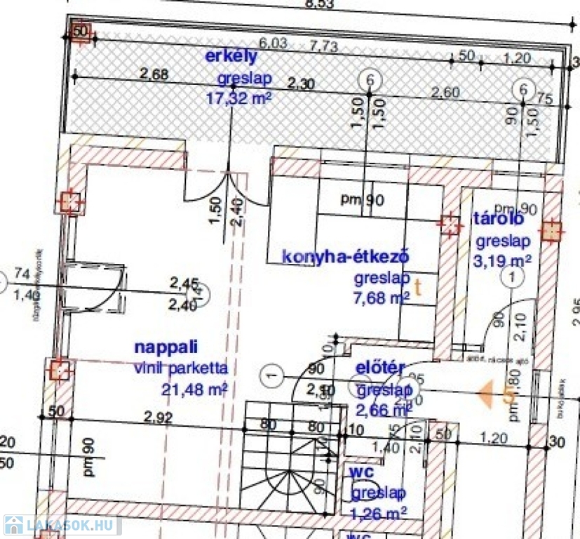 A projekt 5.-ös számú, első emeleti lakása 79,86 m2 lakóterületű, belső kétszintes kialakítású.